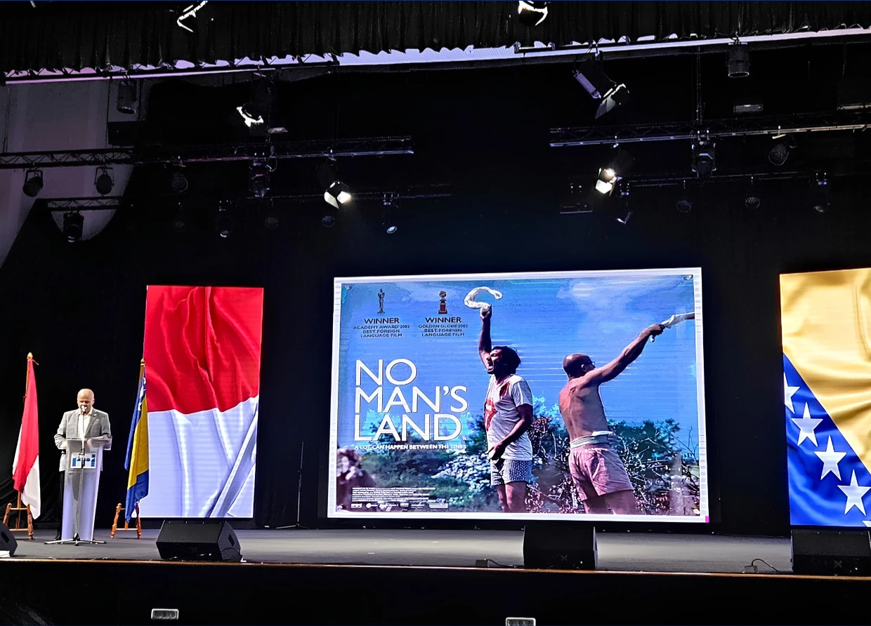 The highlight of the evening was a screening of the acclaimed Bosnian film No Man’s Land (2001), a symbolic choice representing peace and unity amidst adversity. The film, directed by Danis Tanovi?, offers a poignant view of the tragedies of war and earned international recognition, including Academy Award and Golden Globe wins for Best Foreign Language Film in 2002. The story follows two soldiers—?iki from Bosnia and Nino from Serbia—trapped in a trench during the Bosnian conflict, portraying the absurdities of war and the enduring hope for peace.